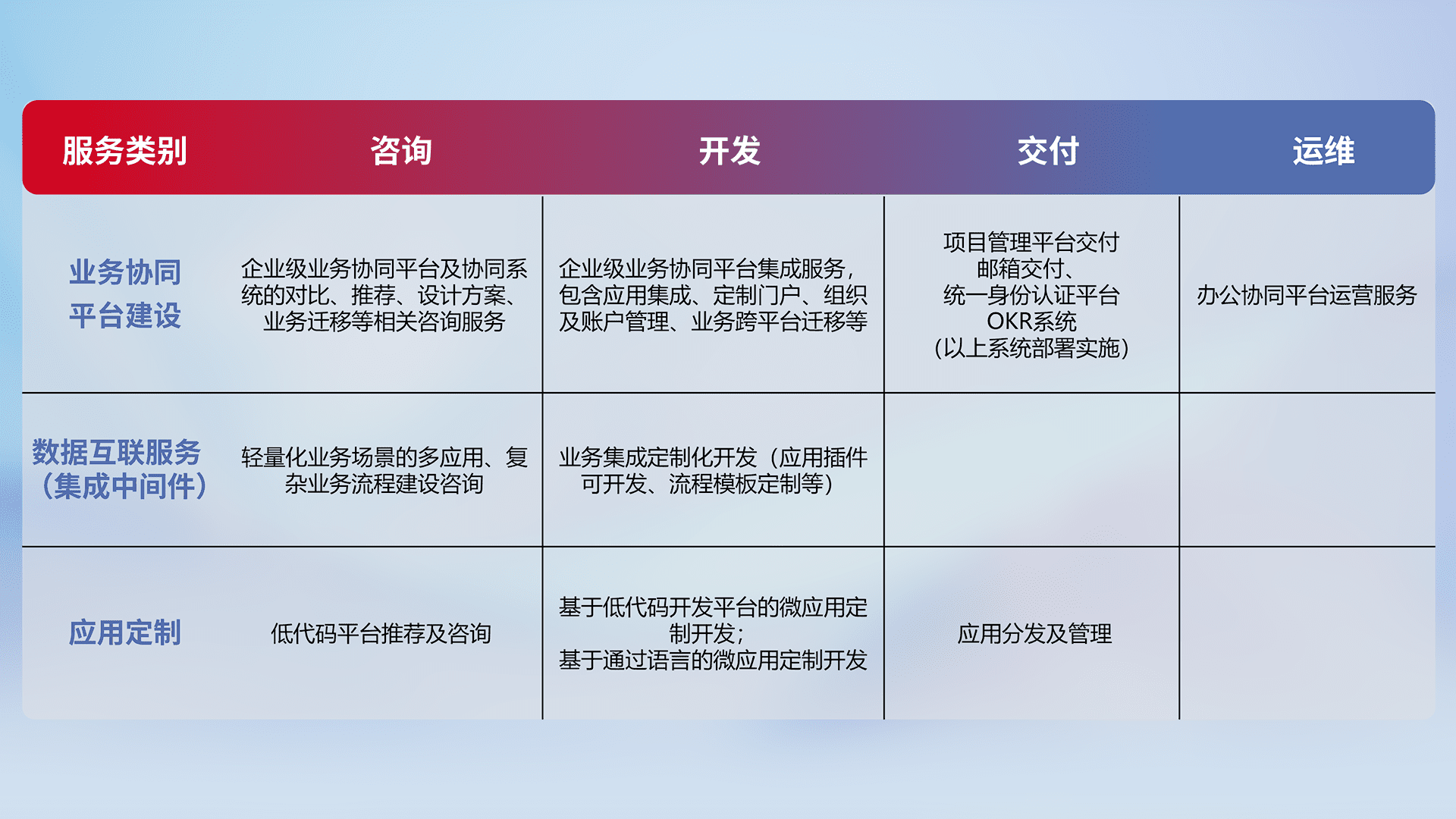 针对钉钉、、、、企微、、、、IDaas等平台级产品提供产品的规划、、、、方案、、、交付、、定制化开发等服务,,,,实现如统一协同办公、、智能客户服务、、、混合会议管理、、、、智能数据查询、、、、等业务场景,,实现数字化转型。。。