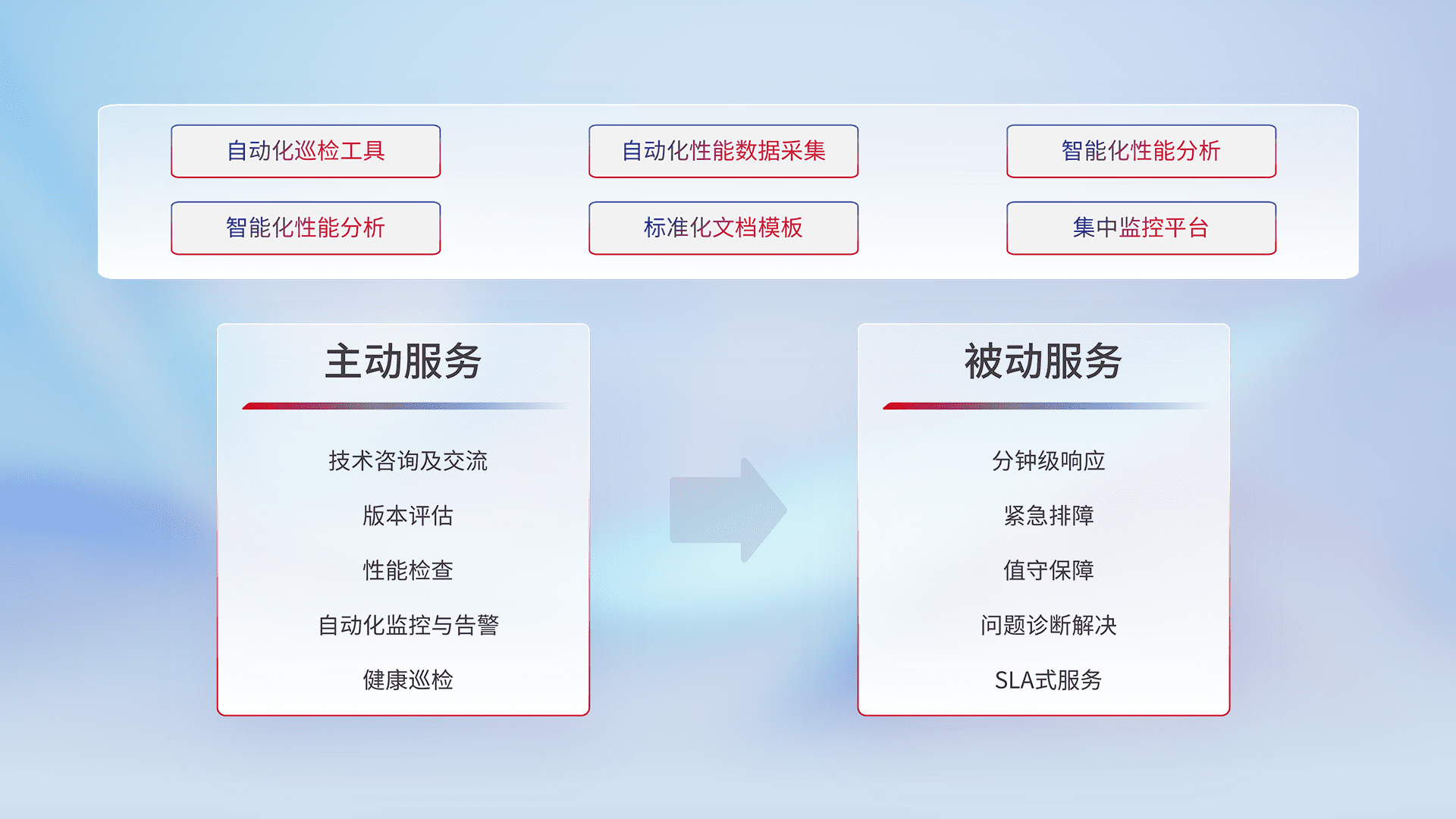 智能化工具和标准化文档,,保障服务质量,,,提供主动服务(包含技术咨询、、、、版本评估、、、性能检查、、自动化监控与告警、、、、健康巡检)和被动服务包含(分钟级响应、、、、紧急排障、、值守保障、、、、问题诊断解决、、、、SLA服务)。。。